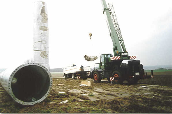 Det nederste tårn element er nu rejst, vognmanden afhenter støbeformen.